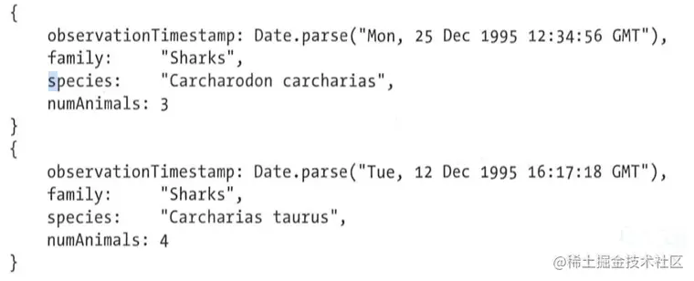例如,假设 observations 集合包含如下两个文档: