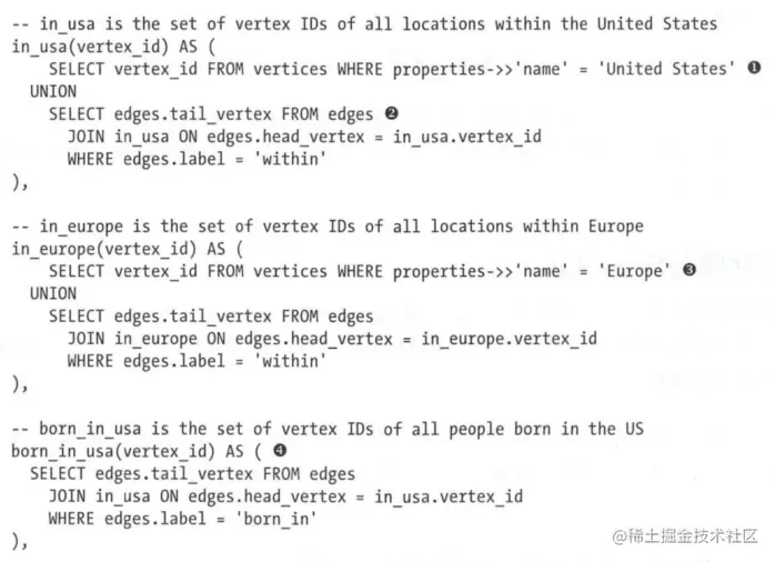 注意在SQL:l999标准以后, 查询过程中这种可变的遍历路径可以使用称为递归公用表表达式(即WITH RECURSIVE) 来表示。这里截取了一部分,但是显然这个查询复杂而且显得臃肿不可理解。