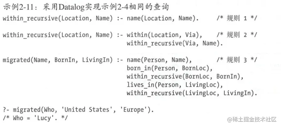 下面为使用Datalog的语法实现上述的查询功能,注意和SPARQL以及Cypher查询语言不同的是它需要每次实现一块功能,。