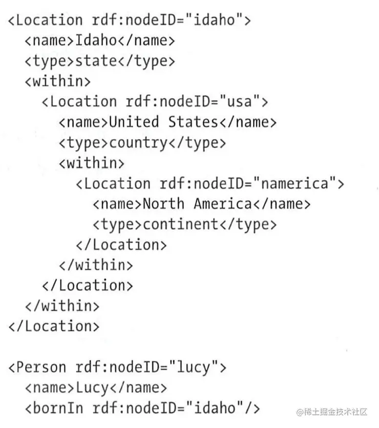 通过Turtle语言实现代表了RDF数据的人类可读格式,目前已经有不少开源组件支持对于这种数据模型格式的转化,比如使用RDF/XML语法。
