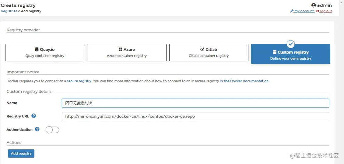 自定义配置阿里云镜像加速仓库。