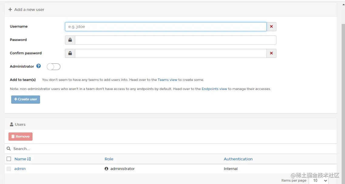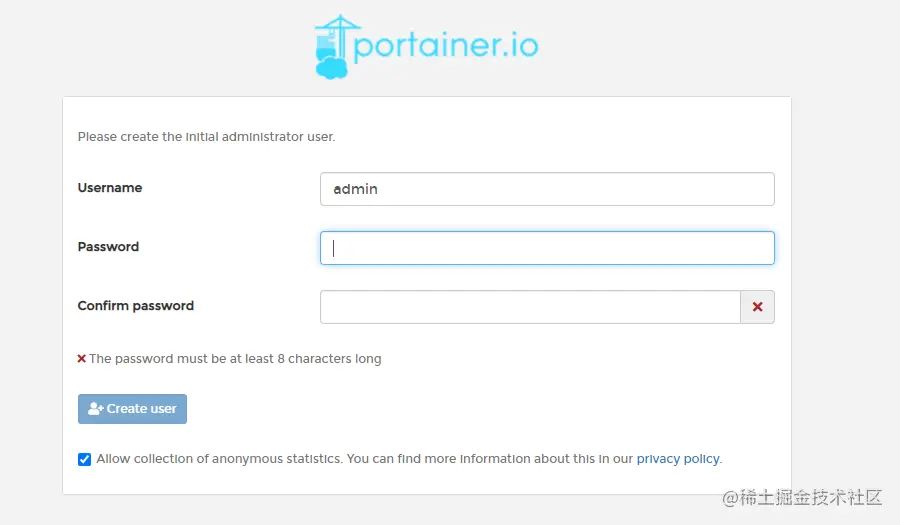 打开页面后,创建登录用户,输入密码,点击创建用户。