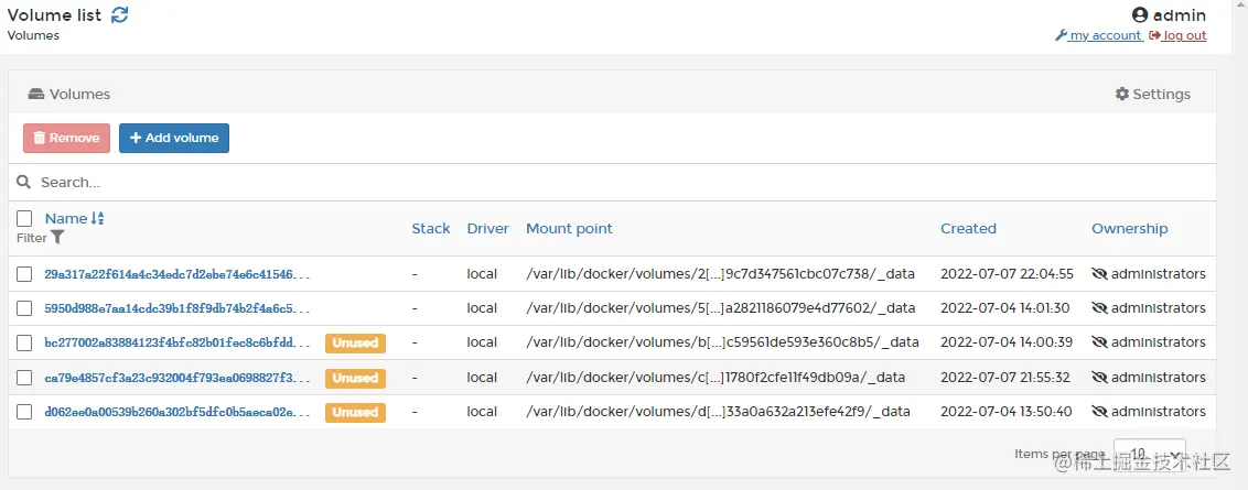 数据卷列表 :可以查看当前数据卷信息、支持新增和删除