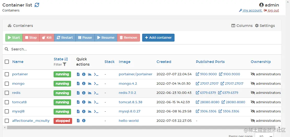 本机容器列表:支持启动、停止、杀进程、重启、删除、添加容器等操作,和敲命令效果是一样的。