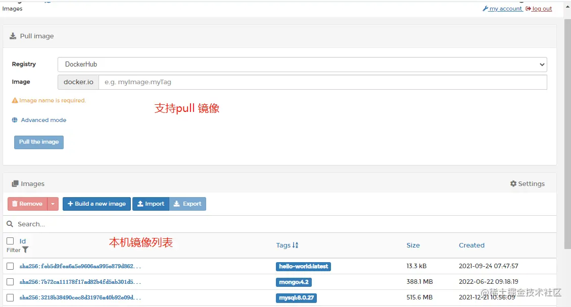 本机镜像列表:支持pull镜像、查看当前本机已安装的镜像