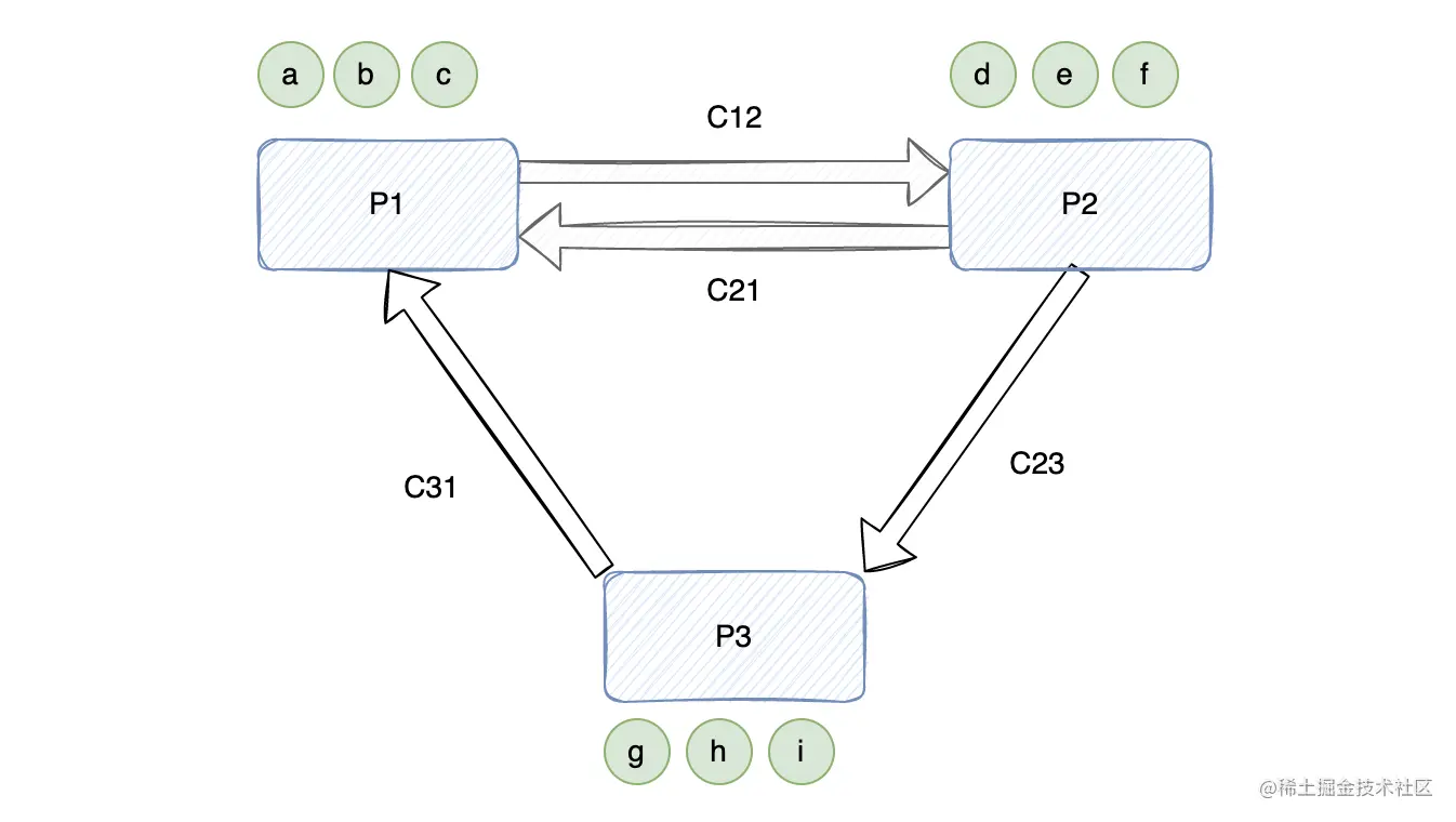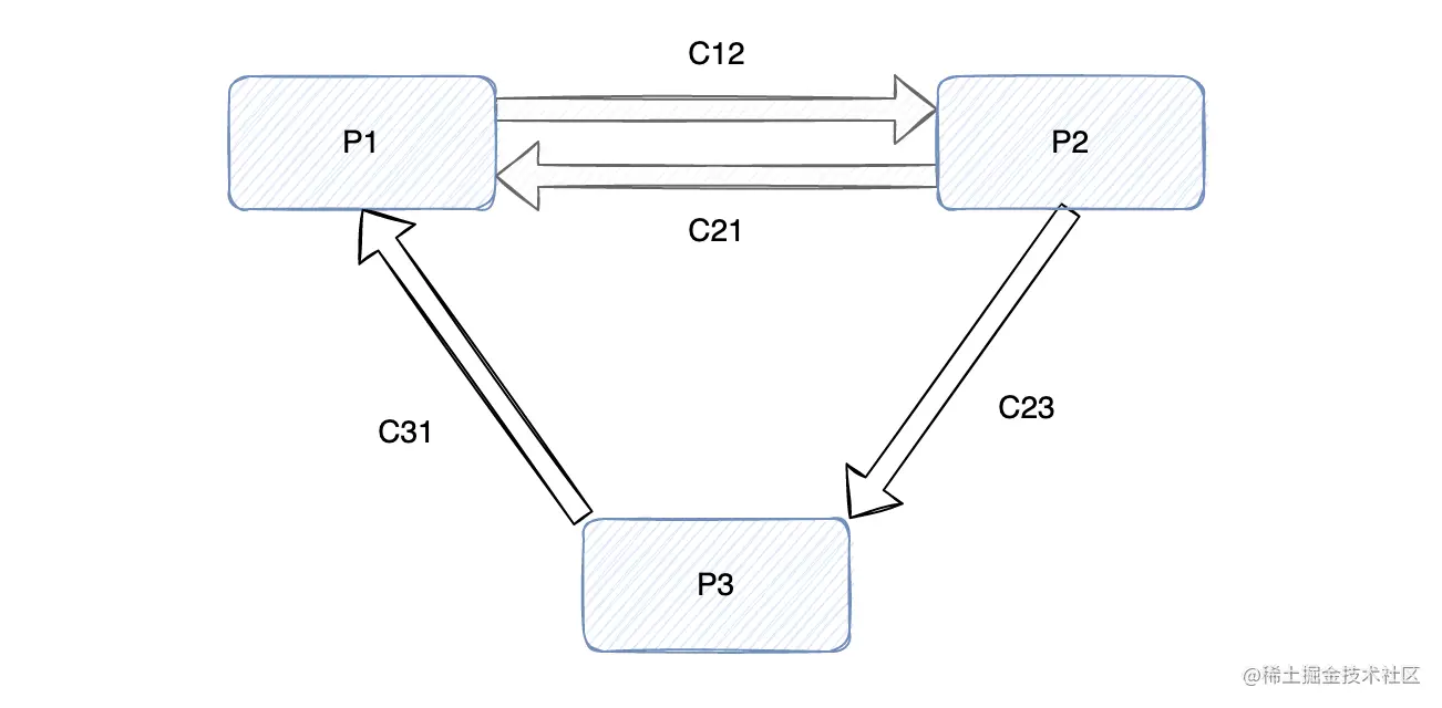 我们假设系统中有 P1、P2、P3 三个进程,C12、C21、C23、C31 四个通道。