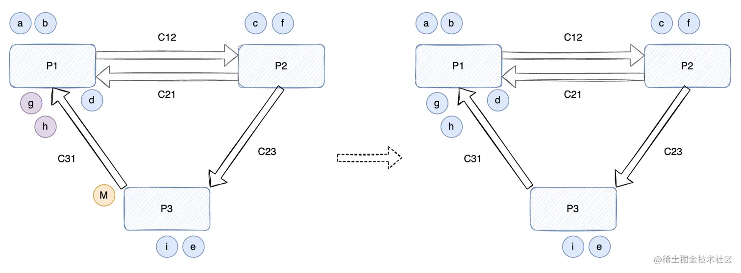 2、系统运行后,假设 P1 通过 C12 给 P2 发送了消息 c,而 P2 通过 C21 给 P1 发送了消息 d、通过 C23 给 P3 发送了消息 e,P3 通过 C31 给 P1 发送了消息 g(下图左)。