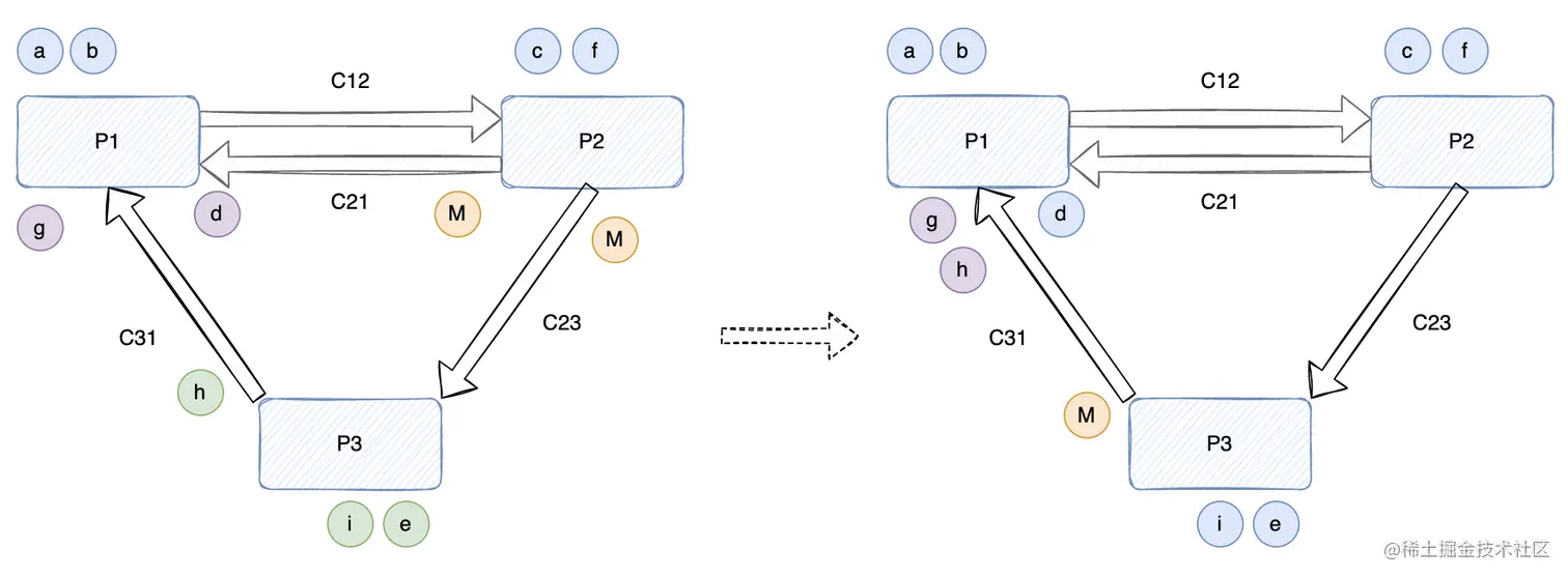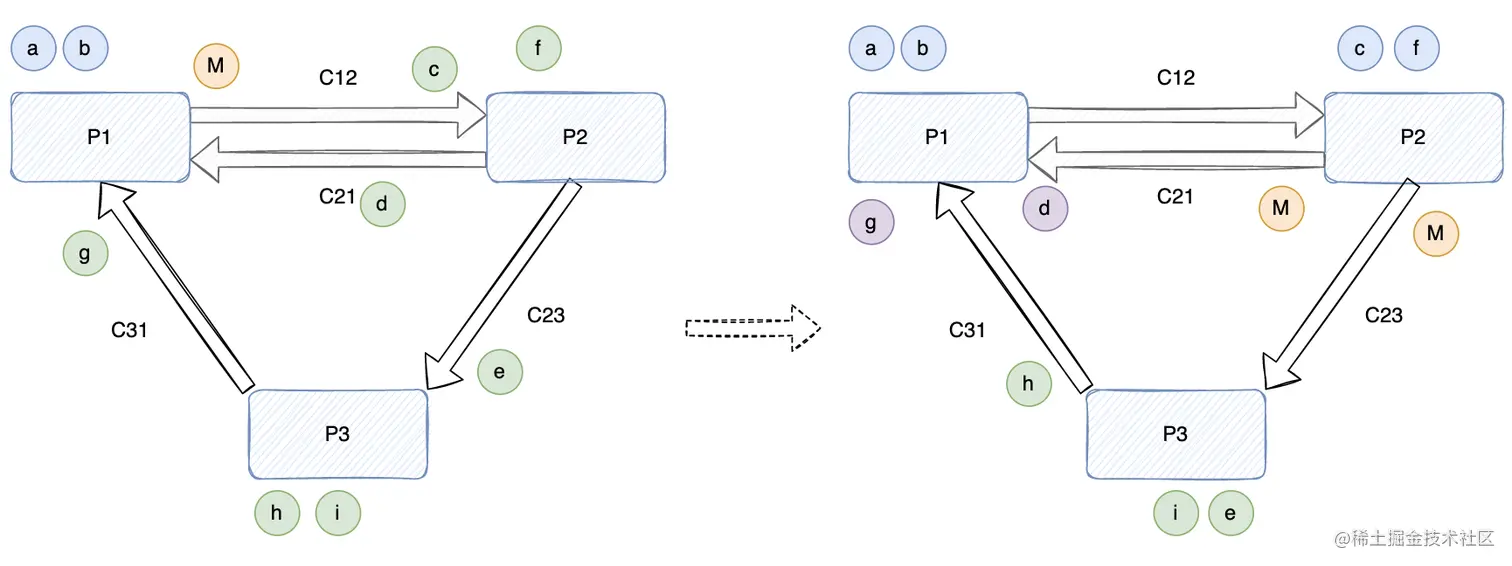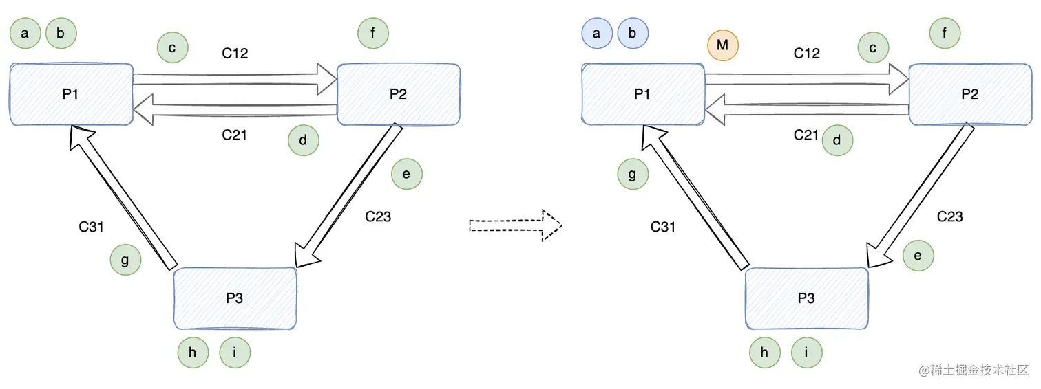 3、(下图右)P2 从 C12 先后(FIFO)收到消息 c 和 Marker 消息 M,此为 P2 第一次收到 Marker 消息: