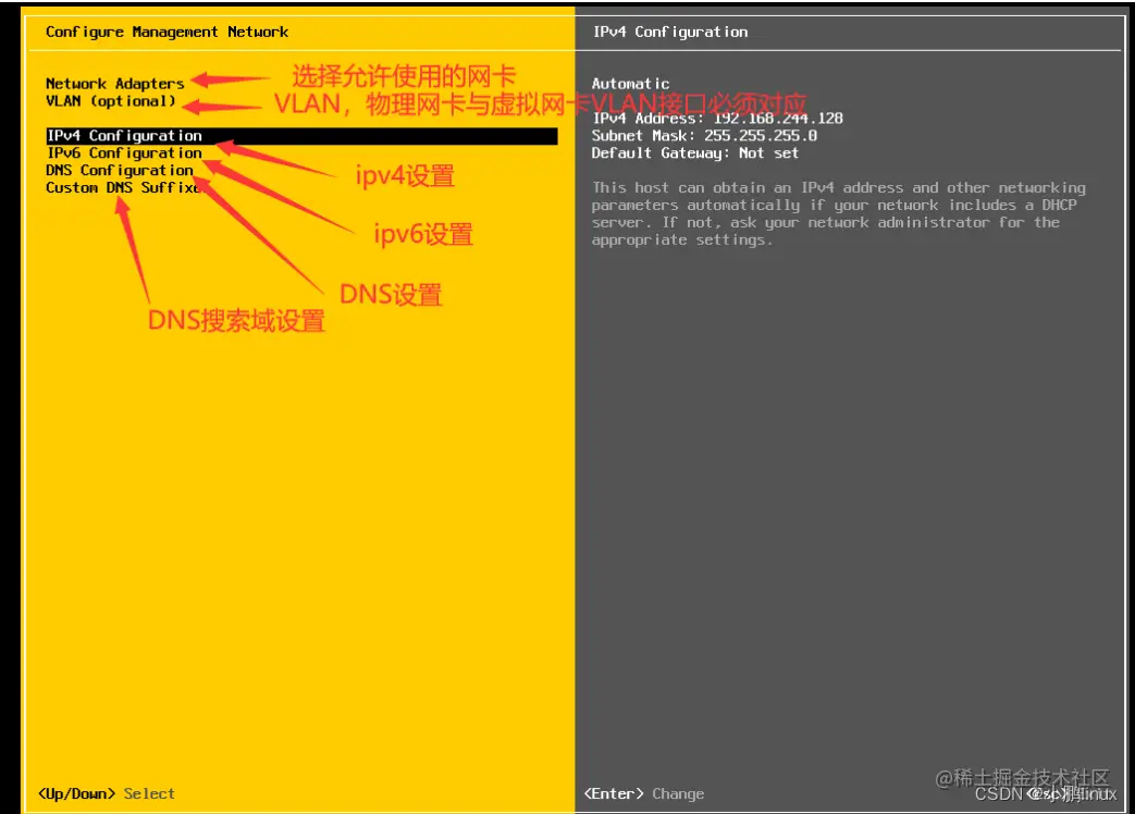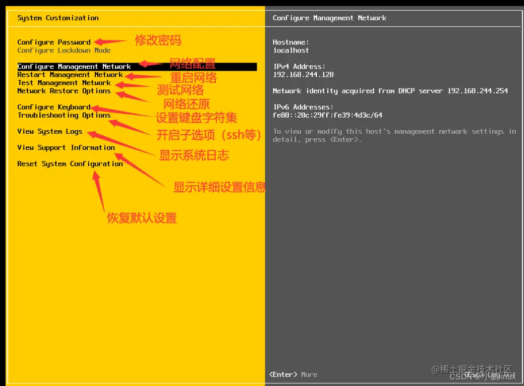 | 然后输入账号root,密码。回车进行下一步;到达如下界面,选择网络配置选项,回车进入: |