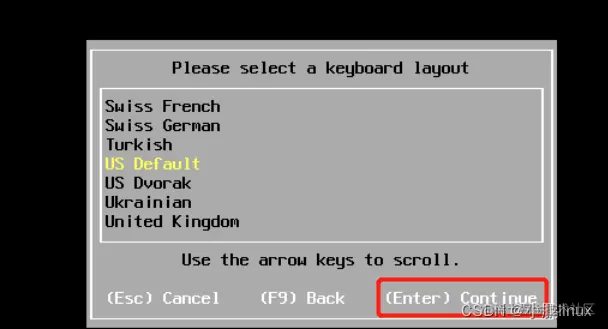 | 到如下界面后选择键盘方案,默认美式键盘即可,直接回车: |