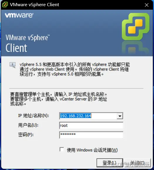 | 回到办公室远程端电脑,打开VMware vSphere Client客户端软件输入ip地址。账户名和密码连接如下图:(如果没有客户端软件,也可以打开VMware虚拟机,点击文件,点击连接服务器。) |