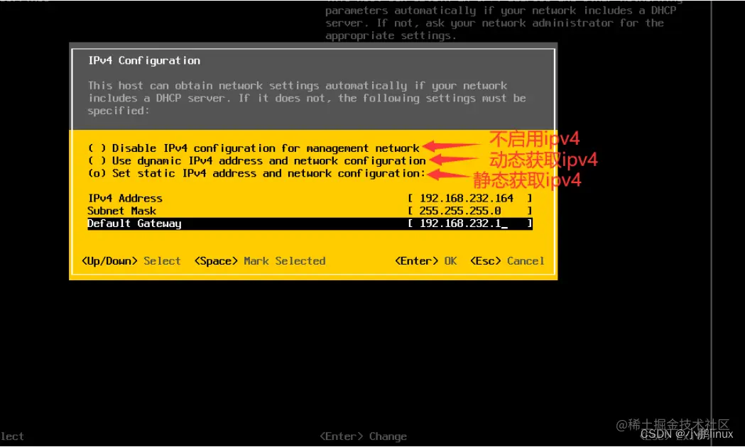 | 到达如下界面,进行网络配置,ip地址必须与客户端电脑的网卡ip处于同一网段; |