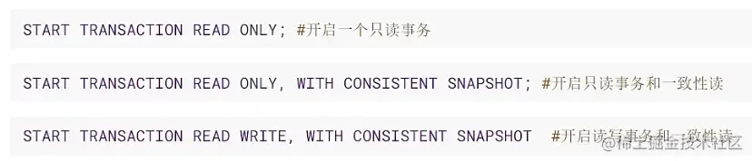 CREATE TEMPORARY TABLE创建的临时表READ WRITE:读写事务,既可以读取数据,也可以修改数据WITH CONSISTENT SNAPSHOT:一致性读- 如果不指定访问模式,默认为