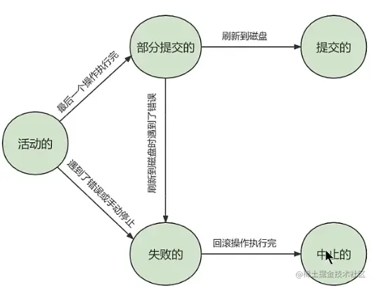 - 部分提交的(partially committed) :事务的所有操作执行完成,但由于操作都在内存中执行,所造成的影响还没有刷新到磁盘前的状态