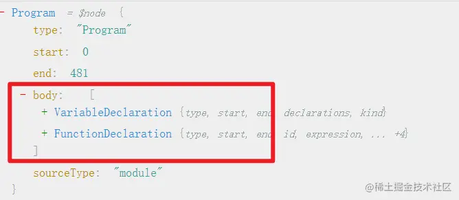 program代表的是整个程序的节点,它的body属性代表的是程序体,body属性的值是一个数组(statement数组),数组中存放的就是具体执行的语句的集合。