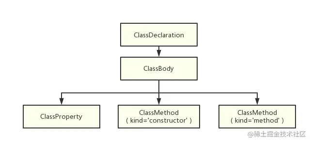 整个class的内容是ClassBody,属性是ClassProperty,方法是ClassMethod(通过 kind 属性来区分是 constructor 还是 method)