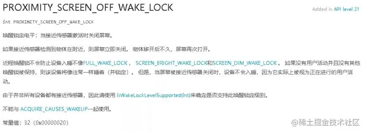 直接上 Android 官网找跟电源相关的 API,发现了 PowerManager,在其中找到了一个电平模式 PROXIMITY_SCREEN_OFF_WAKE_LOCK。