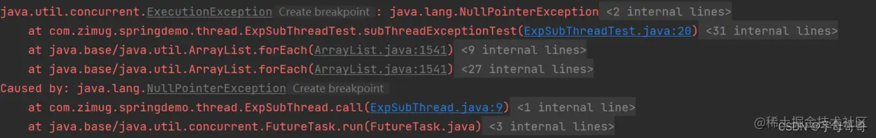 下面这张图是上面的测试用例程序程序e.printStackTrace();的效果,从图中可以看到两个Exception异常,一个是我们在子线程任务中以模拟的方式主动抛出的空指针异常,另一个由于空指针引发的get方法抛出的ExecutionException。