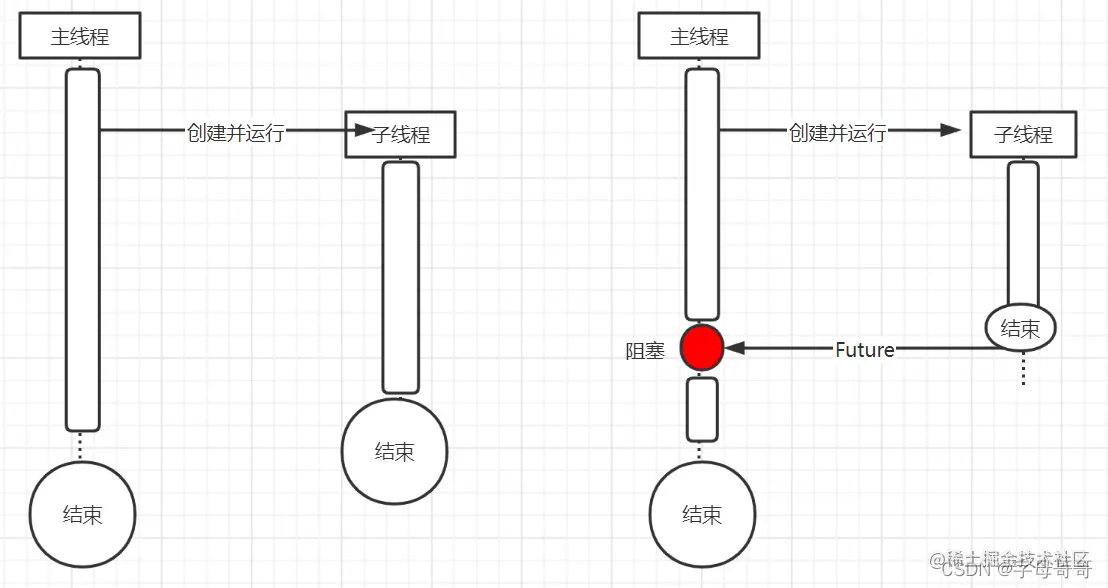 右侧的图,体现了主线程启动一个子线程之后继续执行主线程程序逻辑,在某一节点通过阻塞的方式来获取子线程的执行结果。
