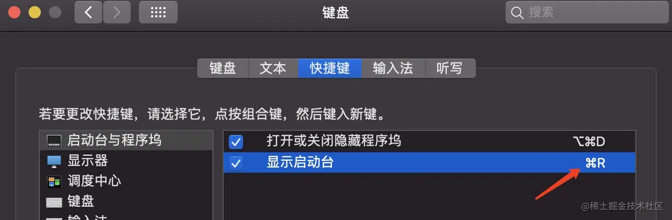 3,快捷键启动台,默认是没有打开的,手按在键盘上再来触摸板四指触发不够酷,所以快捷键是必须的,在这里,我用了 command+R,就好像开始运行一样^_^