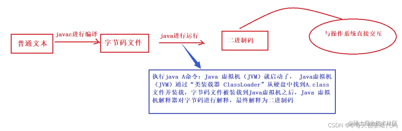 文件装载到JVM当中,JVM启动“解释器”将字节码解释为“1010...”这种