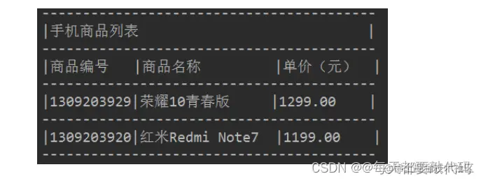 System.out.println("|1309203929|荣耀10青春版 |1299.00 |");