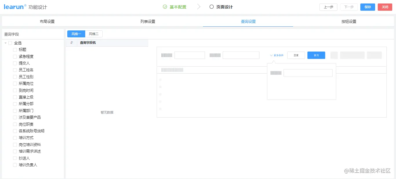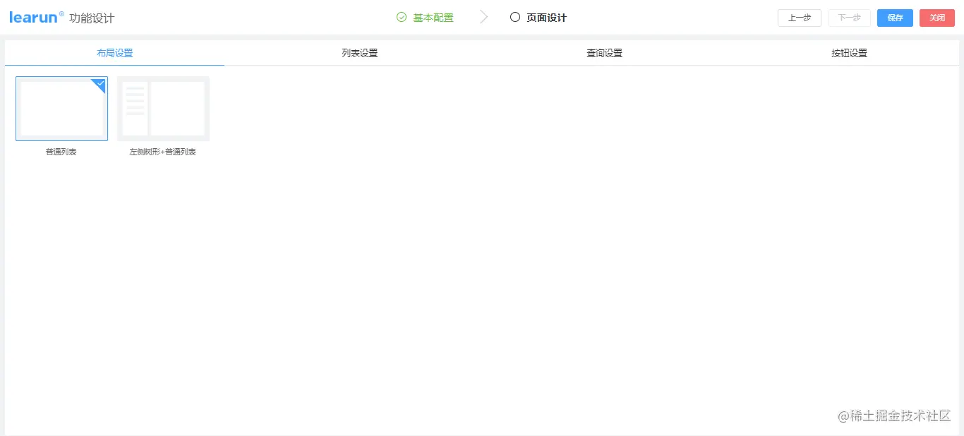 点击[下一步]即进入页面设计。用户在[布局设置]里可选择普通列表或加上左侧树形结构。