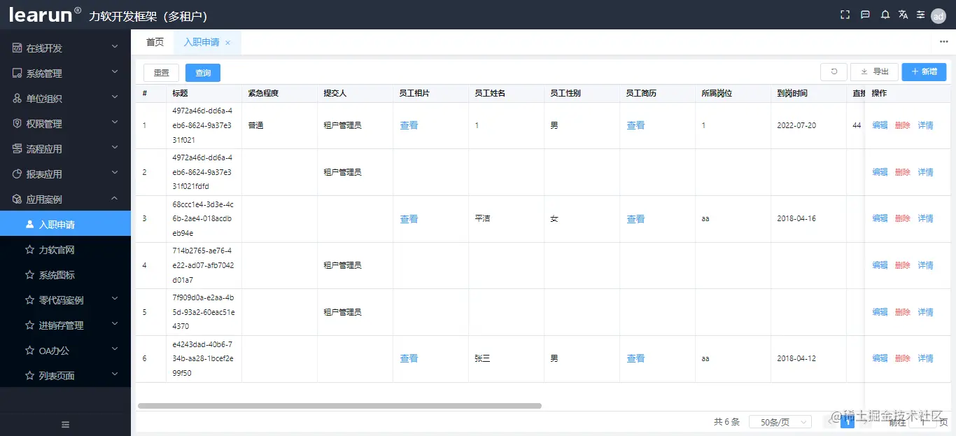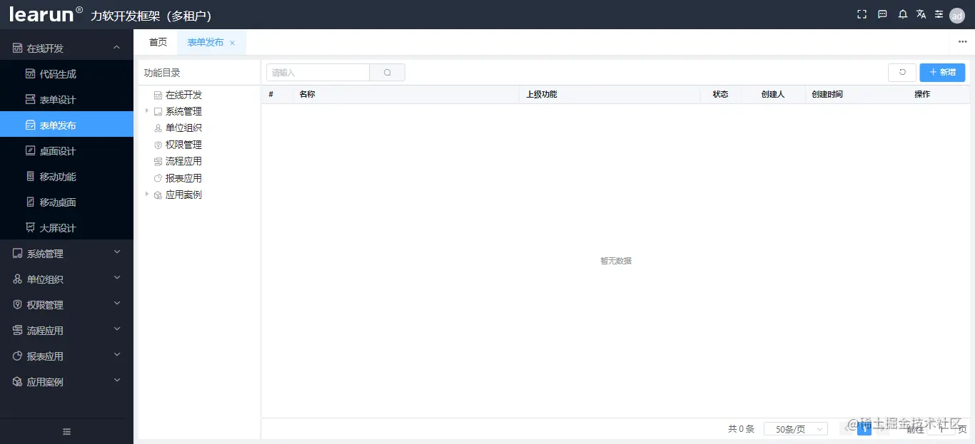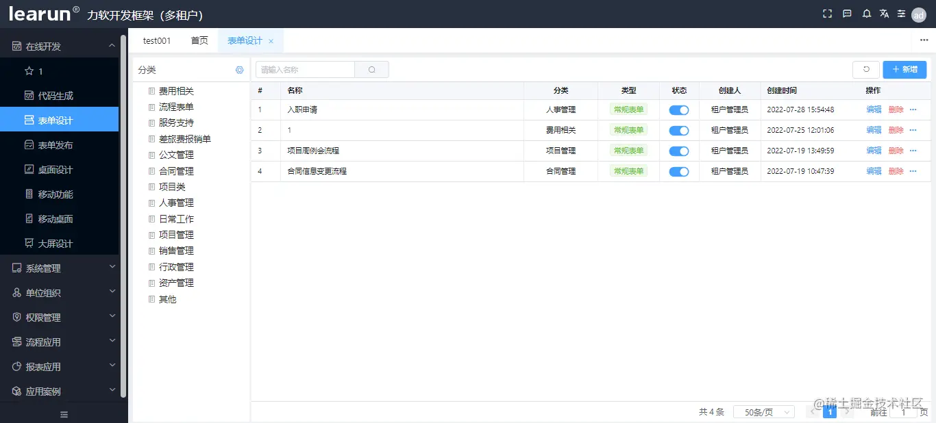 LeaRun.net快速开发框架通过归纳常规web组件和业务组件,归纳单一职责服务接口从而构建出通过配置生成动态表单,利用动态化表单,将开发工作抽象为配置工作,在统一的管理端维护字段及校验等,将服务端开发人员的生产力解放出来,节省大量的开发时间和测试时间,改变生产方式,提高生产力。用户如想查看更多表单设计模板可前往