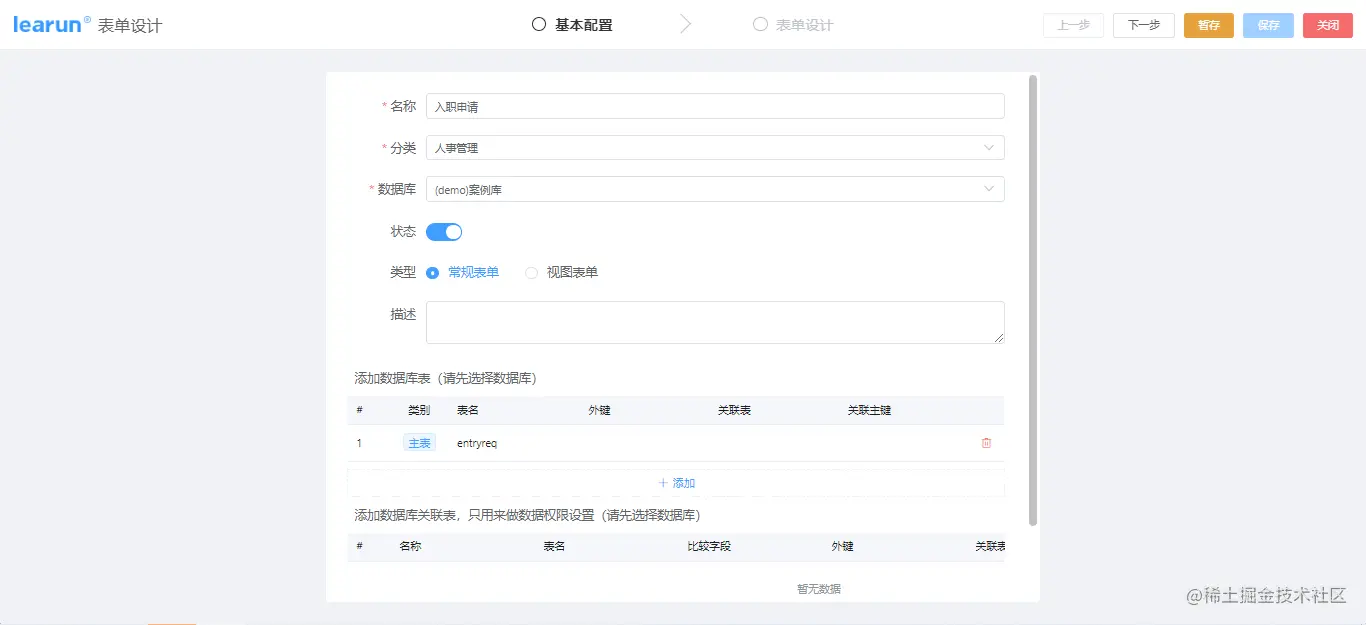 点击[新增],用户即可创建一个新表单。用户按照提示填好表单标签[名称]及[分类],并勾选好该表单所需的数据库和数据库表,便可以点击[下一步]进入表单内容设计界面。