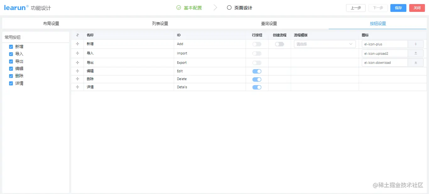 [按钮设置]除了勾选行按钮外,用户也可以勾选[创建流程]来创建流程表单,LeaRun.net快速开发框架也支持企业配置属于自己的流程审批工作流,并对每个流程节点的权限进行单独的权限配置,在[流程设计]中设计好审批工作流,在[流程模板]中直接选定即可实现表单审批流程。