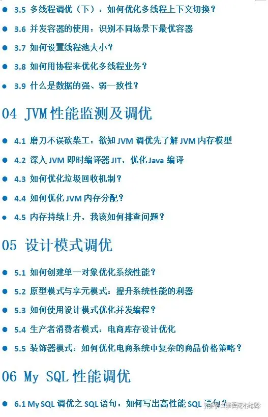 看起来是挺错综复杂,但是也不是没有章法可循,可以把 Java 性能调优分成 5 个层级:Java 编程、多线程、JVM 性能检测、设计模式、数据库性能,每个层级下都覆盖了最常见的优化问题。