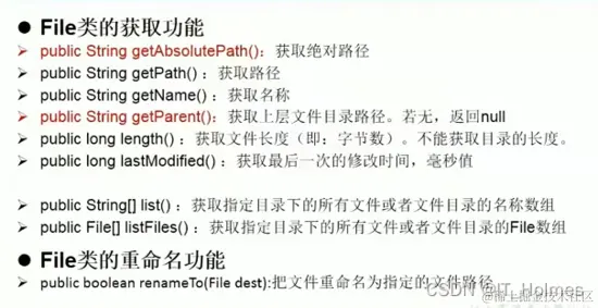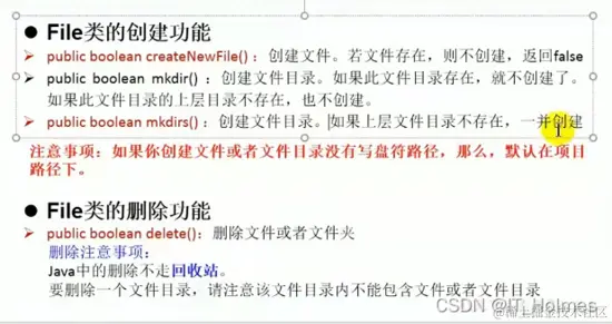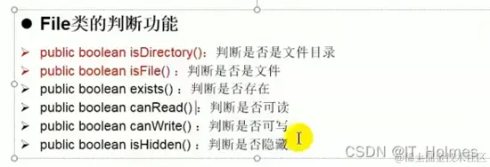 - File类中涉及到关于文件或文件目录的创建,删除,重命名,修改时间,文件大小等方法,并没有涉及到写入或读取文件内容的操作,如果读取写入文件需要io操作完成(将file对象作为参数)。