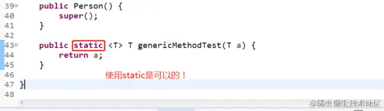 注意,泛型方法中可以使用static,原因也很简单,就是我们的类型在调用该 [静态泛型方法] 之前已经确定了和 [上面的使用泛型参数但不能使用staitc的方法 ]不同!