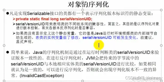 注意:如果需要让某个对象支持序列化机制,则必须让对象所属的类及其属性是可序列化的,为了实现可序列化,该类必须实现如下接口中的一个: Serializable 和 Externalizable ,另外还要设置一个long常量serialVersionUID。