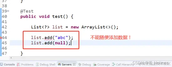 但是对于List<?>是不能向其内部添加数据的,话句话说不能调用add方法,但除了list.add(null)之外。