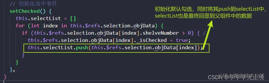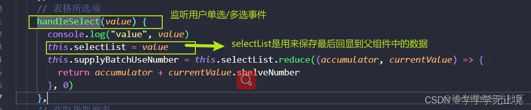 最主要的思路: 修改input的值之后,修改原本tableList中该row下shelveNumber数据,后面手动勾选的时候(勾选的也是tableList的数据),然后根据table中的@on-selection-change事件,将这个勾选项push到selectList中(用来保存需要回显的数据)
