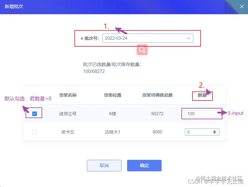 - table中默认勾选项取决于数量这一列的数据,这里有100>0,则默认勾选;有0≯0则不默认勾选