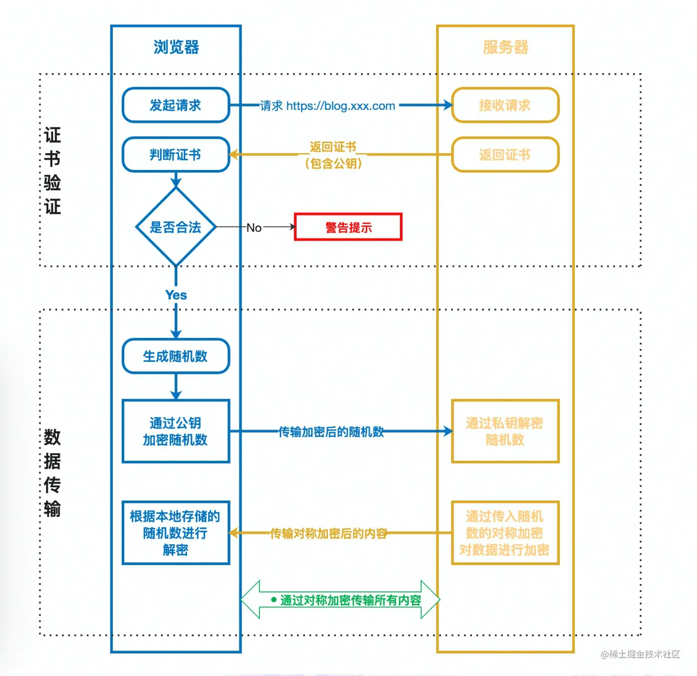 HTTPS是经过TSL或者SSL加密的。加密的方法有分为对称加密与非对称加密。对称加密是指加密与解密都用一个秘钥,非对称是指加密与解密用两个不同的秘钥:公钥与私钥。一般公钥与私钥混合使用加密过程如下图。
