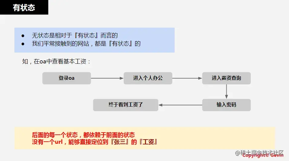 所谓无状态的,即所有的资源,都可以通过URI定位,而且这个定位与其他资源无关,也不会因为其他资源的变化而改变。有状态和无状态的区别,举个简单的例子说明一下。如查询员工的工资,如果查询工资是需要登录系统,进入查询工资的页面,执行相关操作后,获取工资的多少,则这种情况是有状态的,因为查询工资的每一步操作都依赖于前一步操作,只要前置操作不成功,后续操作就无法执行;如果输入一个url即可得到指定员工的工资,则这种情况是无状态的,因为获取工资不依赖于其他资源或状态,且这种情况下,员工工资是一个资源,由一个url与之对应,可以通过HTTP中的GET方法得到资源,这是典型的RESTful风格。谓无状态的,即所有的资源,都可以通过URI定位,而且这个定位与其他资源无关,也不会因为其他资源的变化而改变。