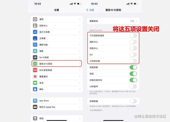 在我们手机的设置中选择【面容ID与密码】选项,输入密码进入后下拉到最后,把“锁定时允许访问”的【今天视图与搜索、通知中心、控制中心、Siri、以信息回复】这五个功能全部关闭掉就可以了。
