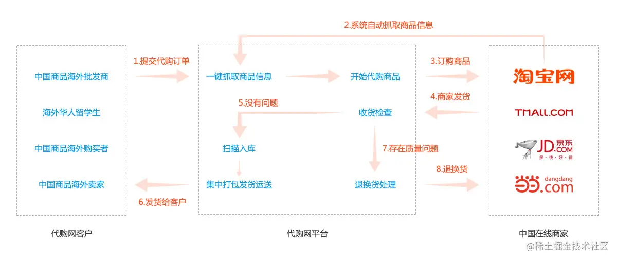 - 代购流程:国外用户选择当地语言当地货币支付选择订购淘宝商品并且支付商品费用,后台根据前端用户采购商品属性进行淘宝采购下单,然后发货至中国物流仓,中国物流仓打包称重后前端用户根据收货地址选择对应的物流下单付款,后台收到付款后安排配套物流派送,前端收货。