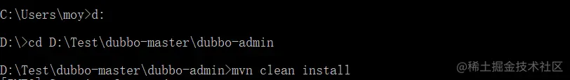 2、解压后,打开cmd进入dubbo-admin目录下,如我解压的目录为:D:\Test\dubbo-master\dubbo-admin,在cmd下输入命令:mvn clean install