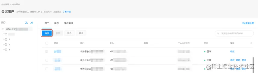 - 选择“企业管理 > 会议用户”,单击“添加”。