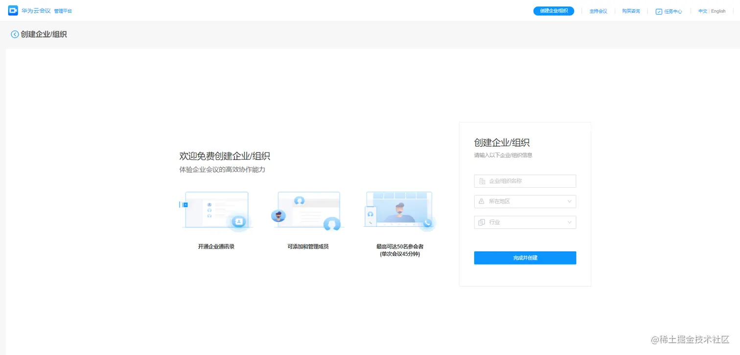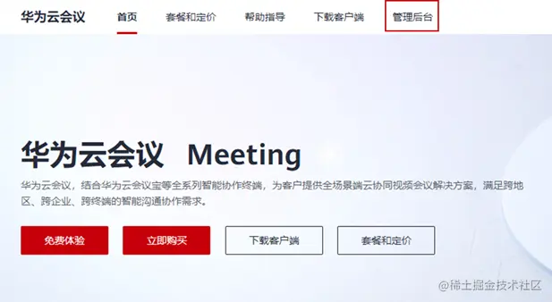 - 使用华为云账号通过华为云会议产品首页进入管理平台。