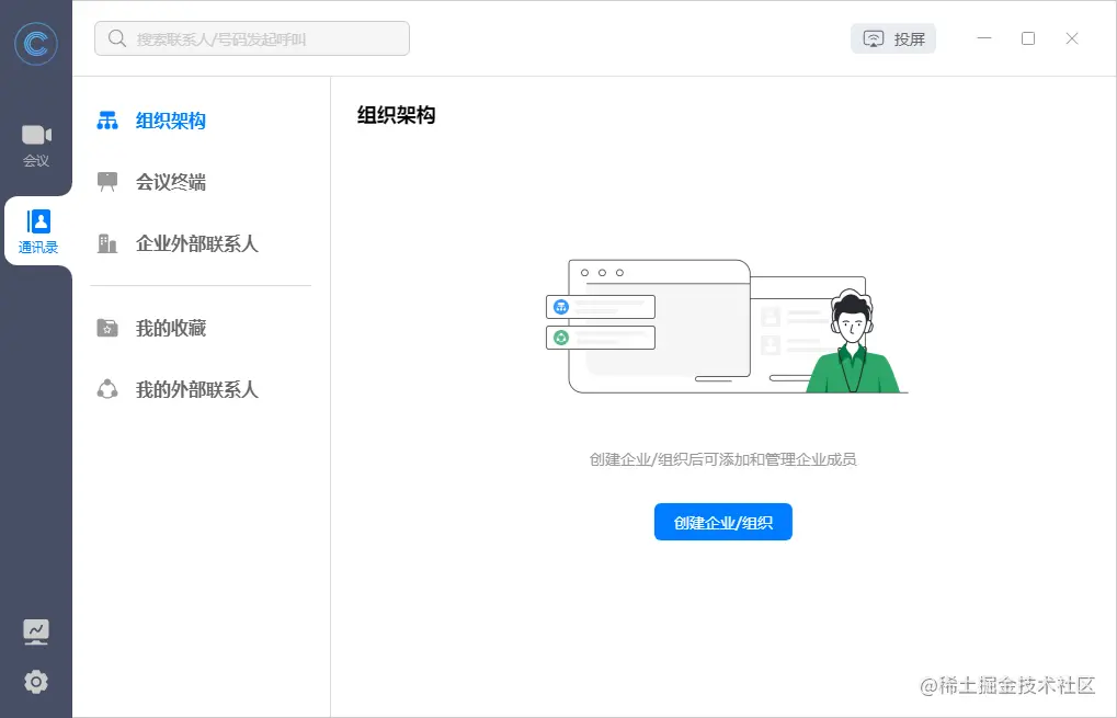 - 在“企业管理”、“终端管理”或“会议管理”页面单击“创建企业/组织”。