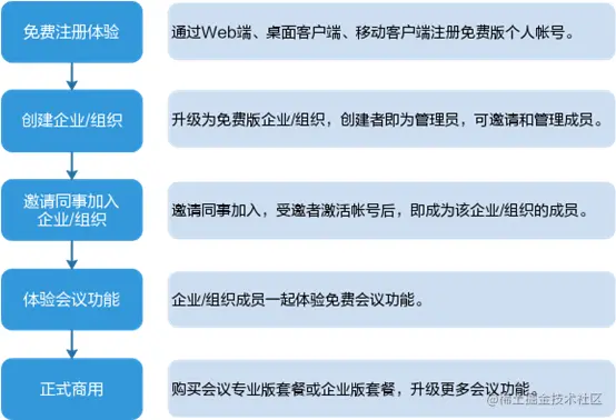 通过Web端、桌面客户端或移动客户端三种方式注册免费版个人帐号。注册成功后,可立即创建会议。