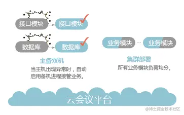 双机是指当主机发生故障时,由备机接管业务;集群是指某个业务节点通过多台集群分担负荷,可以提高系统支持的容量、性能以及可靠性。华为云会议主要系统部件的HA(High Availability)方案如下图所示。