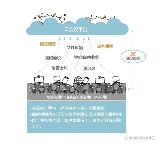 华为云会议支持流量控制(简称流控),在系统发生过载的情况下,通过拒绝新呼叫的手段,也能保证部分正在运行的业务正常运行,并促使整个系统逐渐恢复正常。