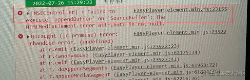 我们打开控制台发现,播放器抛出SourceBuffer错误,出现如下错误大概率是视频流异常导致播放器无法解码。
