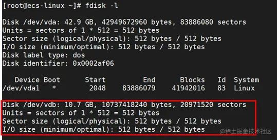 表示当前的弹性云服务器ECS有两块磁盘,“/dev/vda”是系统盘,“/dev/vdb”是新增数据盘